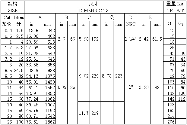 型 號 | 公稱容積/L | 公稱通徑/mm | 公稱壓力/MPa |